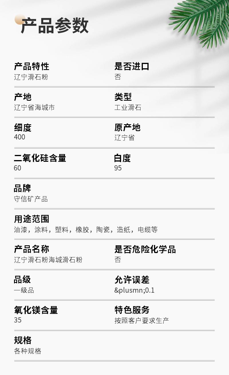 - 关键指标:白度70%-95%,二氧化硅15%-60%,氧化镁≥30%,吸油值低,无石棉,低铁含量,
